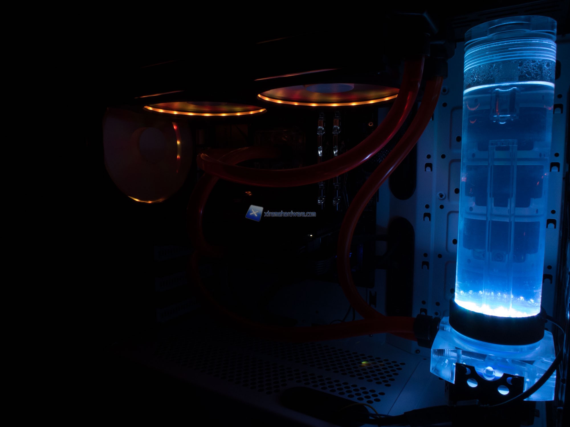 La gestione dell’illuminazione RGB avverrà tramite il tasto posto lateralmente sul case che vi darà la possibilità di passare da un colore ad un altro o scegliere un effetto Cycling intermittente o eventualmente disattivare completamente l’illluminazione. L’illuminazione RGB dei frame Halos di base avviene collegando semplicemente i cavi presenti e alimentandoli con il connettore SATA.